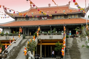 Located to the north of town on the road to the airport, Vinh Nghiem pagoda is distinct because of its constant activities at the attached school, as well as for the daily workings of the many monks and nuns housed here. I visited when the place was in preparation for a funeral, and it was like the set of a Hollywood movie, complete with egoistic flower coordinators and a bevy of fawning assistants. Housed under large, sloping Chinese-style roofs, with upturned cornices, the temple has two floors, with a grand sanctuary on the second floor (often closed to visitors) and a more utilitarian hall on the ground floor, as well as large block of classrooms and housing for monks and nuns, some of whom may come out and greet you in the hopes of practicing their English. A visit here is popular in conjunction with the Hoa Binh Noodle Shop .